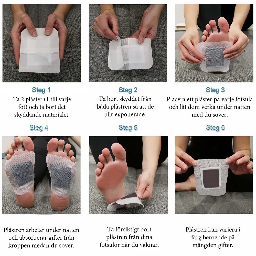 Enligt kinesisk örtmedicin har kroppen över 360 akupunkturpunkter, varav 60, tillsammans med 7000 nervändar, finns på fotsulorna. Därför anses fötterna vara en idealisk plats för att stödja kroppens reningsprocess, och detoxplåster har skapats för detta ändamål. De innehåller naturliga ingredienser, inklusive lavendel, och verkar genom att långsamt absorbera oönskade orenheter genom fötterna under natten. Tekniken gör detoxplåstren både enkla och bekväma att använda.