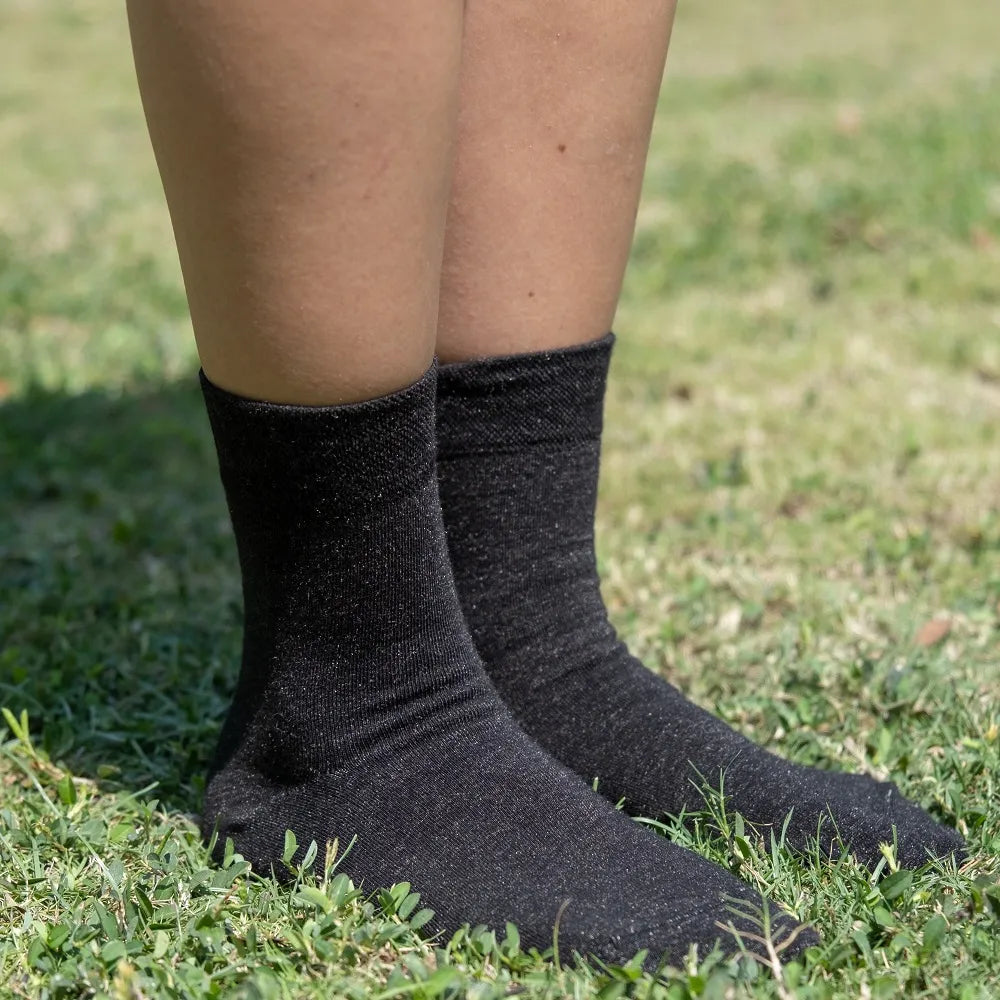 Våra silversockar är tillverkade av 90 % mjuk bomull och 10 % invävda silvertrådar – en kraftfull kombination av komfort och funktion.